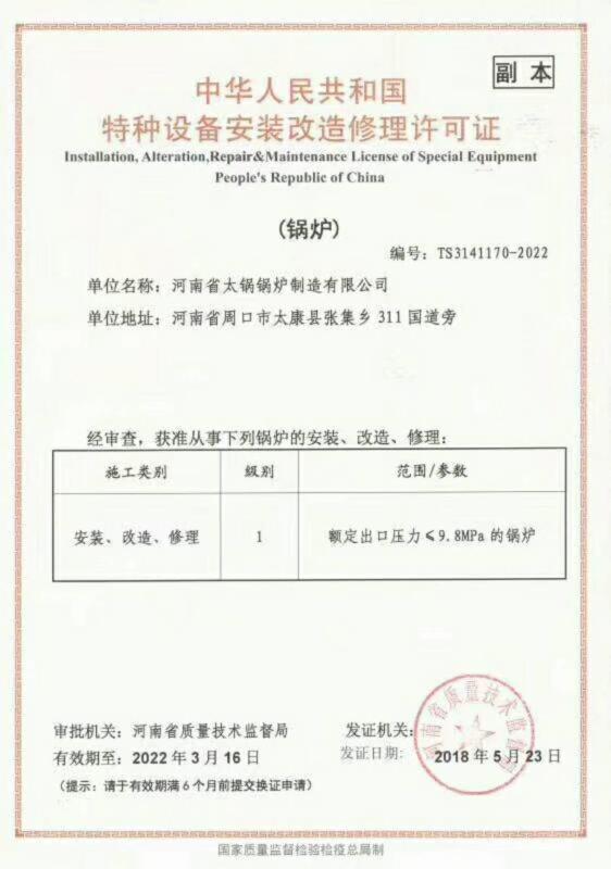 河南省太鍋鍋爐制造有限公司(原河南省太康鍋爐廠始建于1976年)始建于70年代初,經40多年的艱辛探索,靠科技興業,走科學管理之路,現已發展成為承接制造、安裝、設計大、中型供熱系統,生產:SZS燃油燃氣蒸汽鍋爐、燃煤蒸汽鍋爐、燃油鍋爐、燃氣鍋爐、電加熱鍋爐、生物質鍋爐、茶水鍋爐、有機熱載體鍋爐、熱風鍋爐,蒸壓釜、燃油蒸汽鍋爐、燃氣蒸汽鍋爐、燃油熱水鍋爐、燃氣熱水鍋爐并承擔安裝120噸熱水鍋爐、蒸汽鍋爐,生物質鍋爐,加工制造一、二類蒸壓釜、壓力容器,化工機械的省一級**企業。